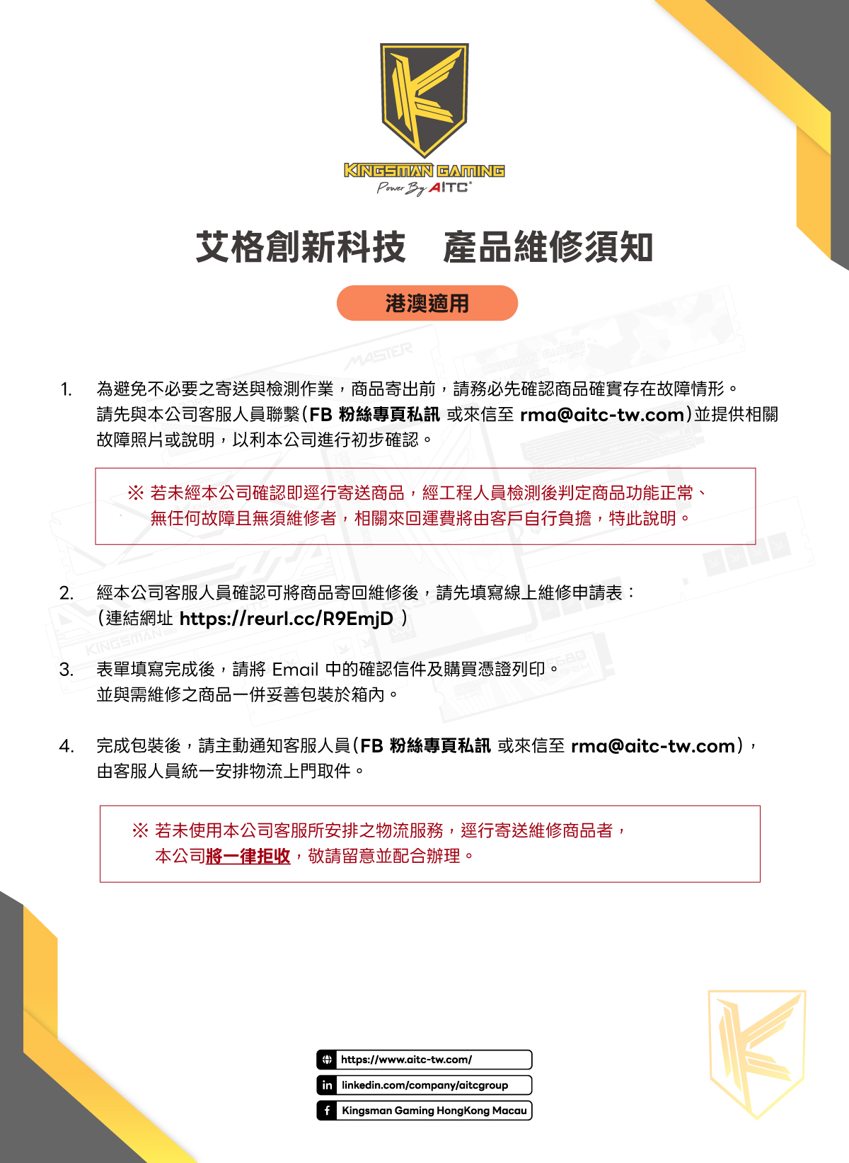台灣與港澳適用,產品送修說明